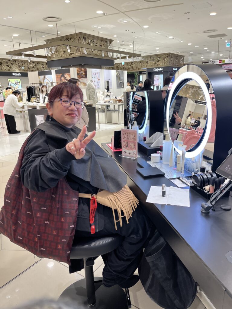 コスメ売り場でアイシャドーなどを